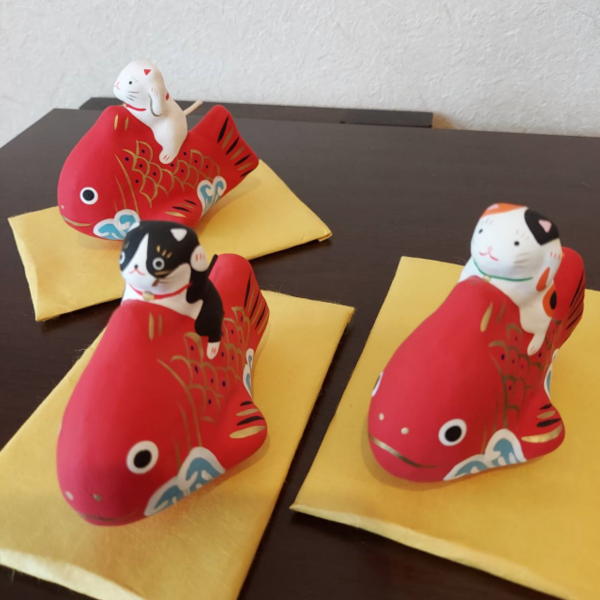 縁起物の鯛に乗ったカワイイ猫ちゃん(ハチワレ・ミケ・白猫の3タイプ) | 日本の伝統文様を染め抜いた優しい肌ざわりのハンカチ | 着色抜染技法で伝統的な柄を染め上げました。贈り物にも喜ばれています。 |